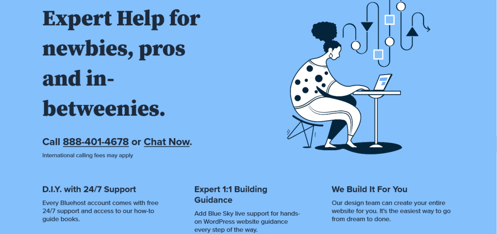 Every Bluehost customer has access to a 24/7 dedicated support line. Wait times are usually but 5 minutes, and therefore the customer service representatives are highly intimate with the technical aspects of Bluehost, WordPress, and WooCommerce. Bluehost also features a Live Chat button on every page. to speak with an expert, the user need only click the chat bubble, enter their name, choose a department, and begin asking questions. Bluehost has completely eliminated email options in favor of round-the-clock live chat, ensuring that users are always ready to receive an instantaneous response.